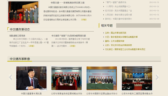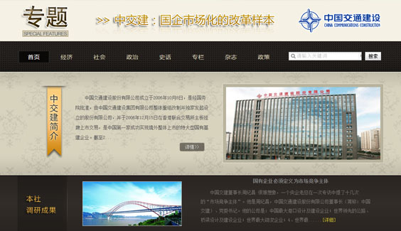 負責(zé)中國交建專題頁面的設(shè)計制作,該頁面以黑色為主色調(diào),加以棕、黃為點綴加以突出,符合企業(yè)特點,體現(xiàn)企業(yè)沉穩(wěn)、安全、實力雄厚。整個設(shè)計,簡潔,大方,彰顯企業(yè)實力。